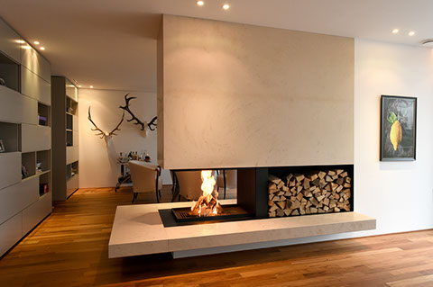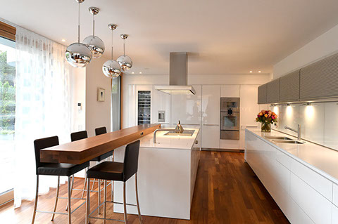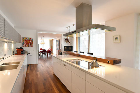 Das Wohnkonzept setzt auf großzügige Räumlichkeiten, die viele interessante und offene Sichtbezüge zulassen und durch den Einsatz von Glas, der je nach Bedarf vor Gerüchen oder thermisch abtrennt. So kann der Flur optisch bis zur Südterrasse geöffnet werden. Die großzügige Küche bietet nicht nur über die Westterrasse den Blick zum Baumbestand, sondern gen Süden zum Essbereich.