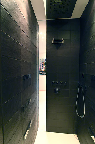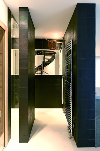Der Wohnbereich sowie zwei Terrassen gen Süden und Westen befinden sich auf der oberen Etage, den Wellnessbereich mit Zugängen zu kleineren Nord- und Ost-Terrassen erreicht man über eine skulpturale Wendeltreppe.