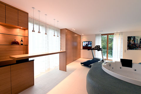 Der Wellnessbereich ist selbstverständlich vom Wohnbereich thermisch getrennt, aber lässt Sichtbezüge zwischen Wendeltreppe zum offenen Duschbereich zu. Auch der Saunagänger kann sich über ein großzügiges Raumgefühl freuen; diese öffnet sich sowohl zum Raum hin und als auch seitlich mit Blick in den alten Baumbestand.