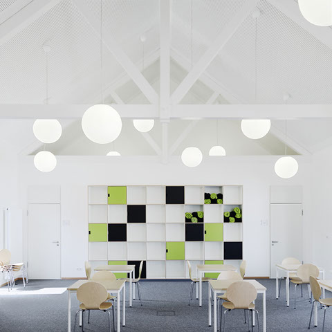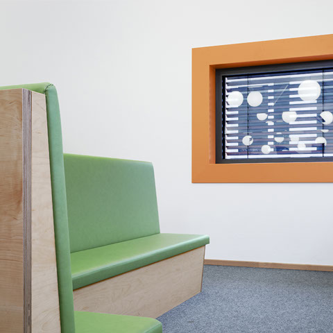 Farbkonzepte im Bestandsgebäude unter Berücksichtigung der bestehenden und z.T bleibenden Ziegelsteine im Innen- und Aussenraum und als Orientierungshilfe insbesondere für Grundschüler der Lilli-Jahn-Schule. Innenraumgestaltung der neu gebauten Bibliothek sowie individuelle Möbelentwürfe.