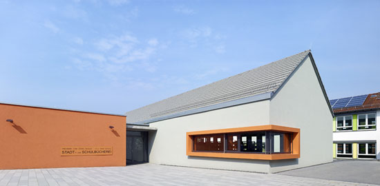 Durch den Neubau der Bibliothek ist der zentrale Zugang zur Schule mit einer einladenden Geste neu inszeniert.