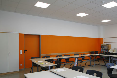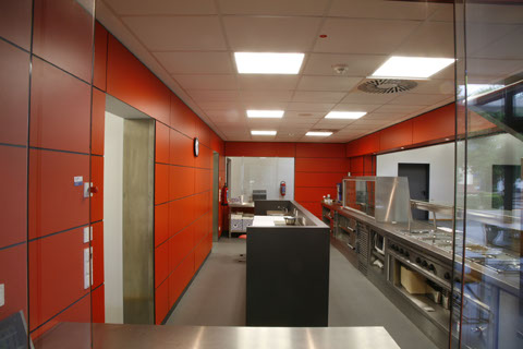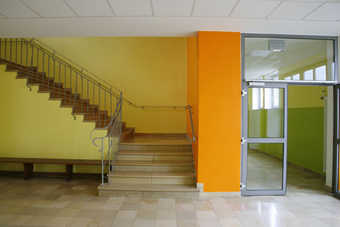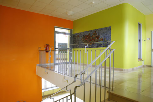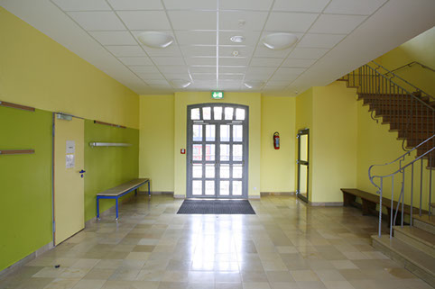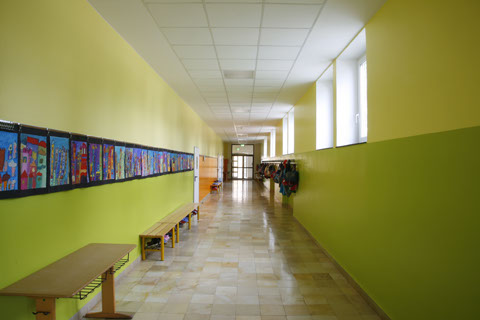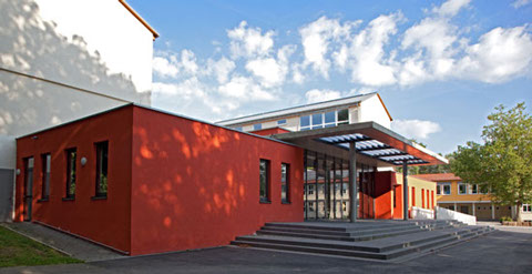 Zudem wurde eine Mensa mit Betreuungsräumen innerhalb des Gebäudekomplexes geplant und realisiert, so dass ein Innenhof entstand.