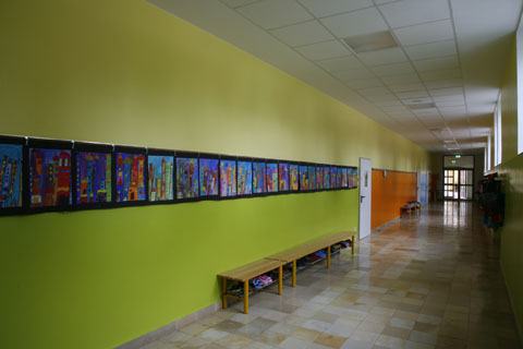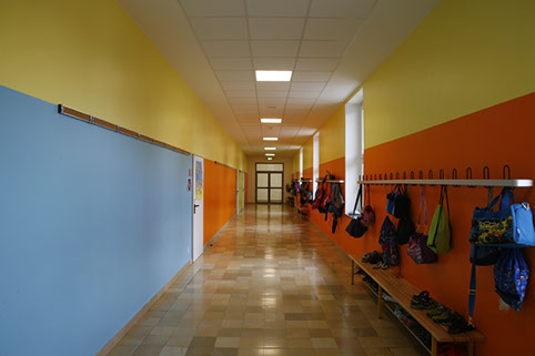 Entwurf aller Innenräume, Farbkonzepte im Bestandsgebäude als Orientierung insbesondere für Grundschüler der Burgbergschule, Möbelentwürfe.