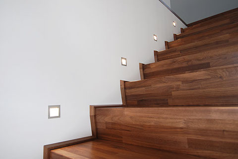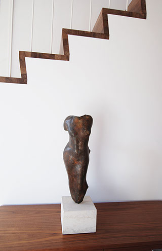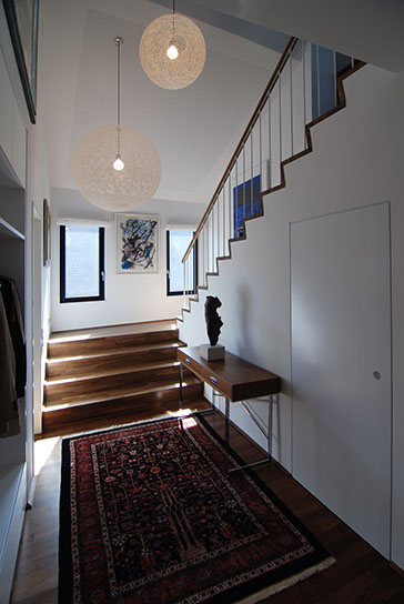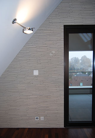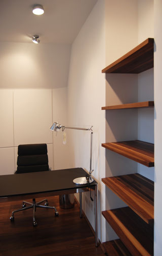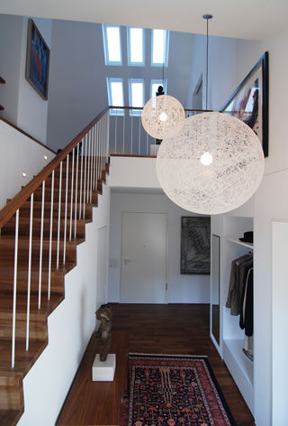 Der Bauherr ist im Besitz vieler wunderbarer Kunstobjekte sowie zahlreicher schöner Teppiche; um diese angemessen zur Geltung bringen zu können, wurde der raumbildende Ausbaus in den Wohnräumen schlicht, aber mit viel Liebe zum Detail entworfen und in Weiß und konsequent einer Holzart ausgeführt.