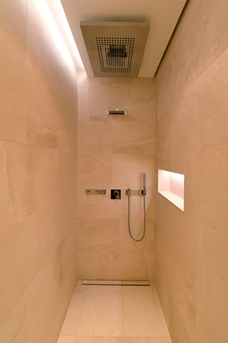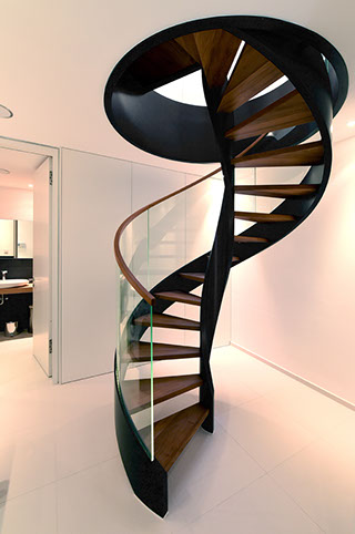 Der Wohnbereich sowie zwei Terrassen gen Süden und Westen befinden sich auf der oberen Etage, den Wellnessbereich mit Zugängen zu kleineren Nord- und Ost-Terrassen erreicht man über eine skulpturale Wendeltreppe.