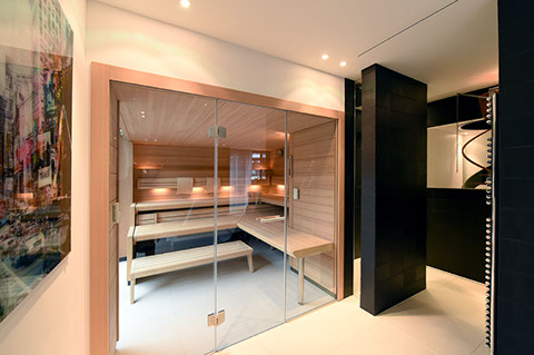 Der Wellnessbereich ist selbstverständlich vom Wohnbereich thermisch getrennt, aber lässt Sichtbezüge zwischen Wendeltreppe zum offenen Duschbereich zu. Auch der Saunagänger kann sich über ein großzügiges Raumgefühl freuen; diese öffnet sich sowohl zum Raum hin und als auch seitlich mit Blick in den alten Baumbestand.