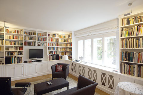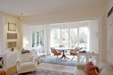 Einbauten wurden zeitgemäß interpretiert, aber fügen sich harmonisch in das ursprüngliche Gesamtbild. Auch hier wurde sich am Bestand orientiert und zu dem hellweiß gestrichenem Holz wurde nur teilweise Eiche verbaut. Somit hatten die Bauherren viel Spielraum für Kunst, farbige Teppiche, lose Möblierung, ohne dass der Raum überladen wirkt.